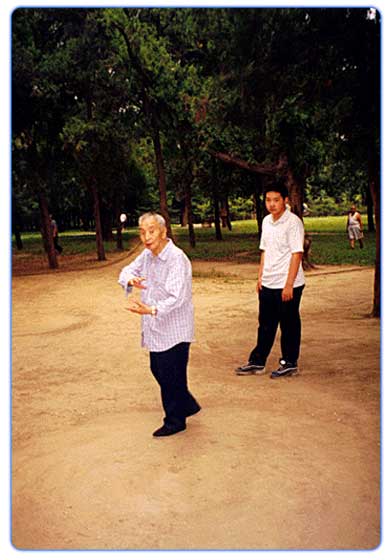 90 Years old Master Liu Xing-Han guiding Master Wang Feng-Ming in Bagua, in Heaven's Temple Park in Beijing 1999.